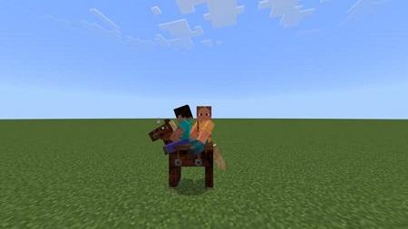 Play with the 2 Players On Horse addon to craft a saddle for two players in Minecraft PE. Equip it on a horse or another rideable animal, and travel the world together with ease.