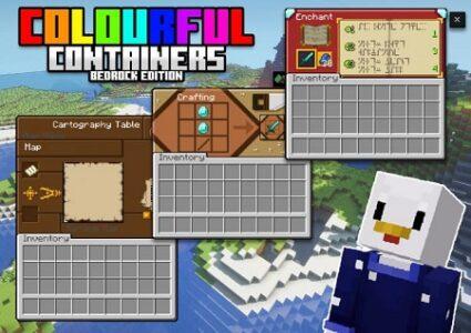 The Colourful Containers v2 textures replace most of the dull, repetitive textures with vibrant, unique ones in Minecraft PE, making it more enjoyable to use crafting tables, anvils, and much more.