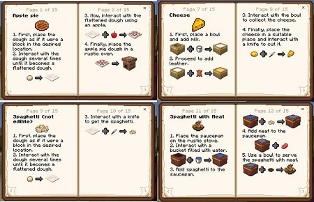 The latest version of the DecoDrop mod for Minecraft PE (Bedrock) introduced decorative food blocks that must be crafted using recipes from a special book. This book is crafted using two knives (which can also be used to slice certain blocks and eat) and a book with a quill. Inside, you’ll find instructions on how to prepare specific dishes, which ingredients to use, and how to interact with the appropriate blocks for cooking.