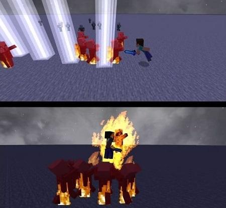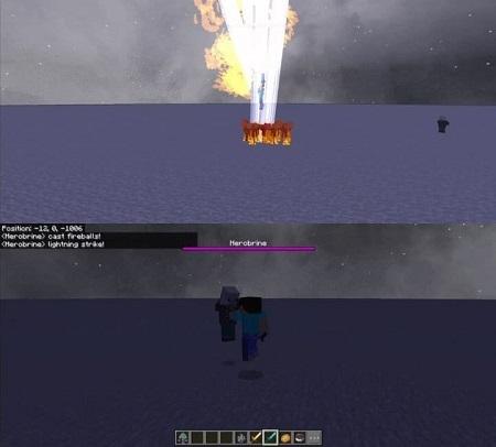 Herobrine’s character design is menacing, with glowing eyes that heighten the intensity of the encounter. Throughout the fight, Herobrine unleashes powerful spells like lightning strikes and fiery explosions, dealing widespread damage.