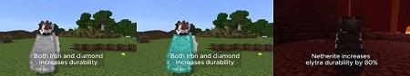 Iron elytras are 40% more durable than standard elytras, diamond elytras are 60% more durable, and netherite elytras are 80% more durable. Netherite elytras also provide fire resistance, allowing you to fly through lava flows.
